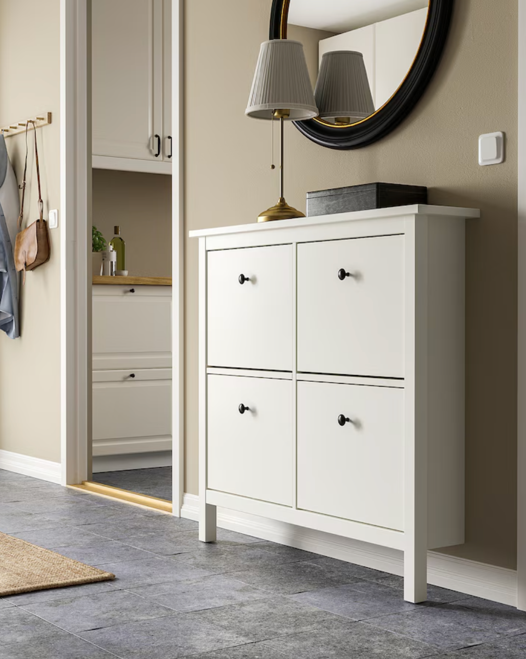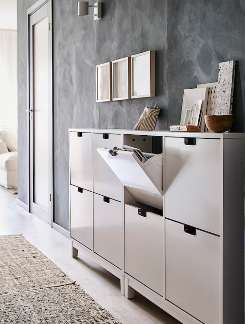 Een kastje met lades is ideaal voor het opbergen van sleutels, paraplu’s, schoenspray, boodschappentassen en andere kleine items die je bij de hand wilt hebben. Is je hal echt smaller dan smal kijk dan eens naar de schoenenkastjes van meubelgiganten zoals Ikea met Ställ of Hemnes. Je kunt er misschien ook wel 2 naast elkaar plaatsen. En helemaal leuk als je ze verft in een mooie passende tint en bijv. de deurknopjes verandert.