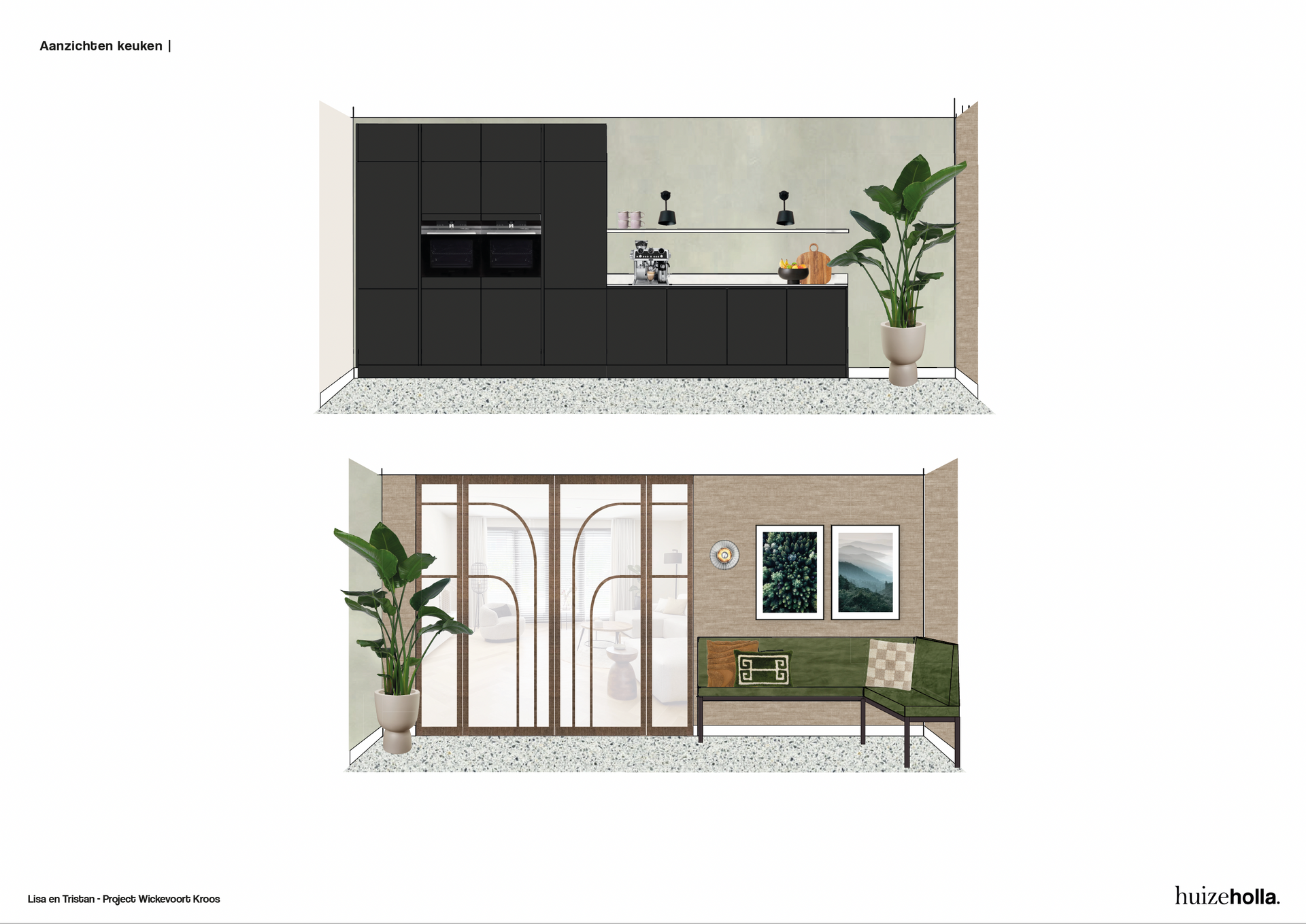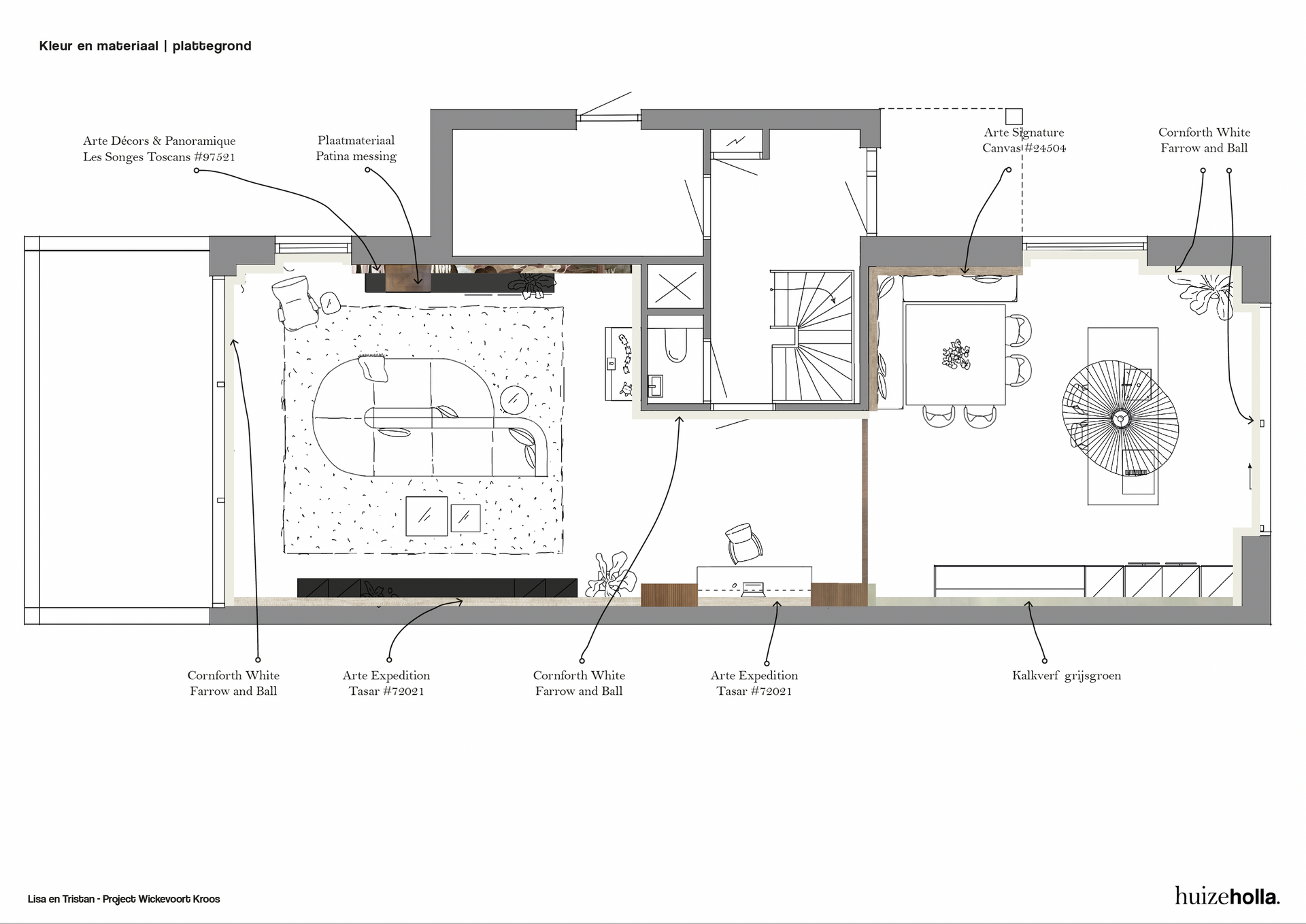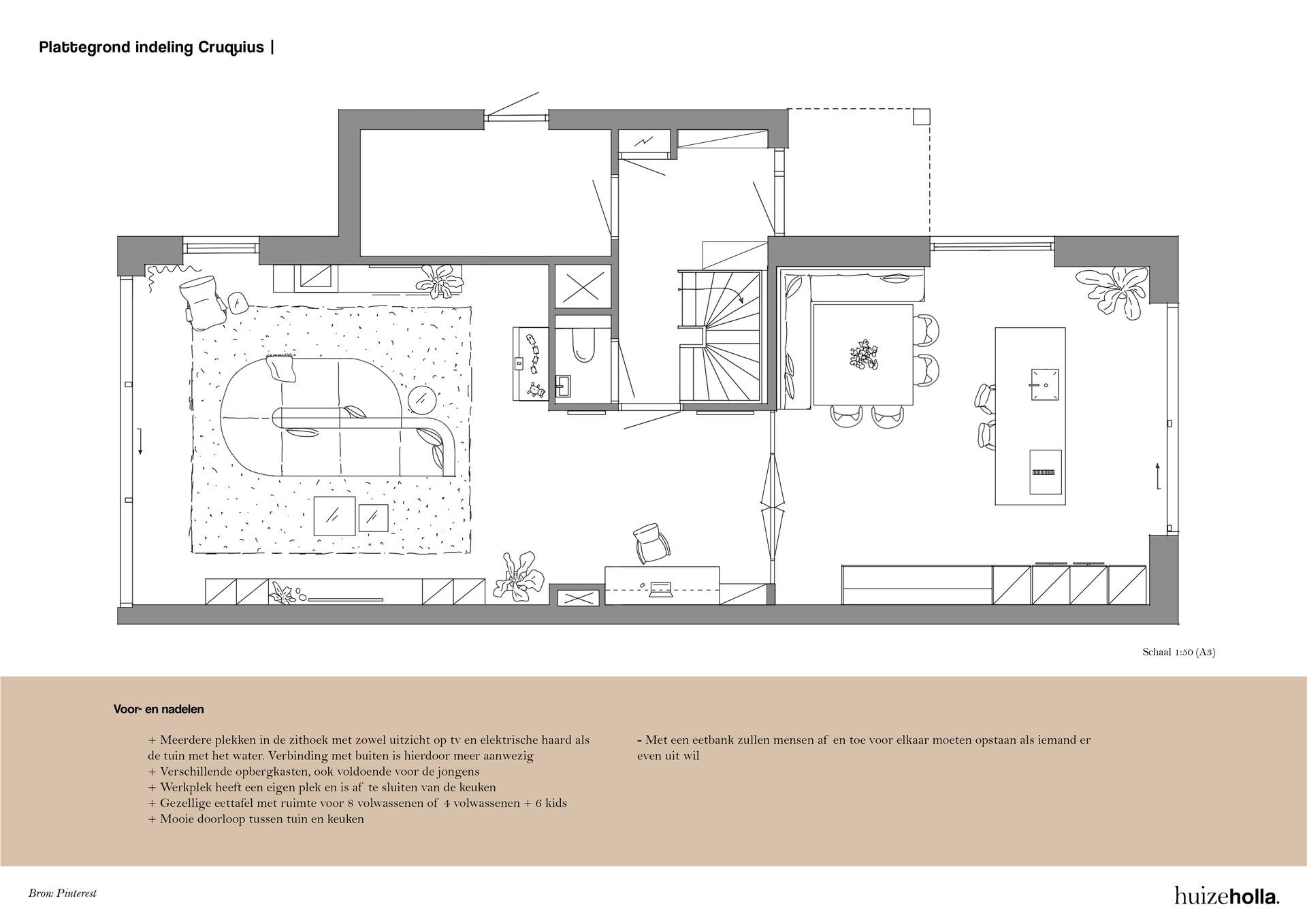 Zo komt er in de woonkamer een dubbele functie, nml een ruime plek voor de tv én een heerlijke plek bij het (elektrische) haardje. Door een modulair en speels zitelement in het midden van de kamer te plaatsen verbind je beide functies en voelt de ruimte als een mooi geheel. Ook de leefkeuken is groot van formaat. Naast een royale keuken met kookeiland komt er ook een gezellige vierkante tafel met zitbank. Je kunt je al goed voorstellen hoe er vriendjes door de schuifpui aan komen waaien om aan te schuiven voor tosti's op woensdagmiddag.