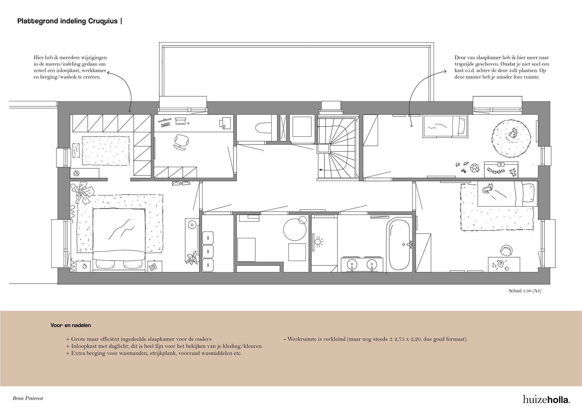 Ook de bovenverdieping had vanuit de bouw 4 ruime kamers. Zo ruim dat het voor 3 slaapkamers en 1 grote werkkamer zelfs een beetje overdreven was. Daarom hebben we 1 kamer in 2 delen gesplitst. Het ene deel wordt een inloopkast voor de ouderslaapkamer. Het andere deel wordt een werkkamer met nog steeds voldoende bureauruimte en een ruime archiefkast. Ook de ouderslaapkamer was zo ruim dat we daar de indeling hebben aangepast voor een extra waskast. Aangezien de woning geen zolder heeft is er anders niet direct plek voor wasmanden of een strijkplank. Op deze manier maak je functioneler gebruik van de ruimte en is het gemakkelijker een opgeruimd en fijn huis te behouden.