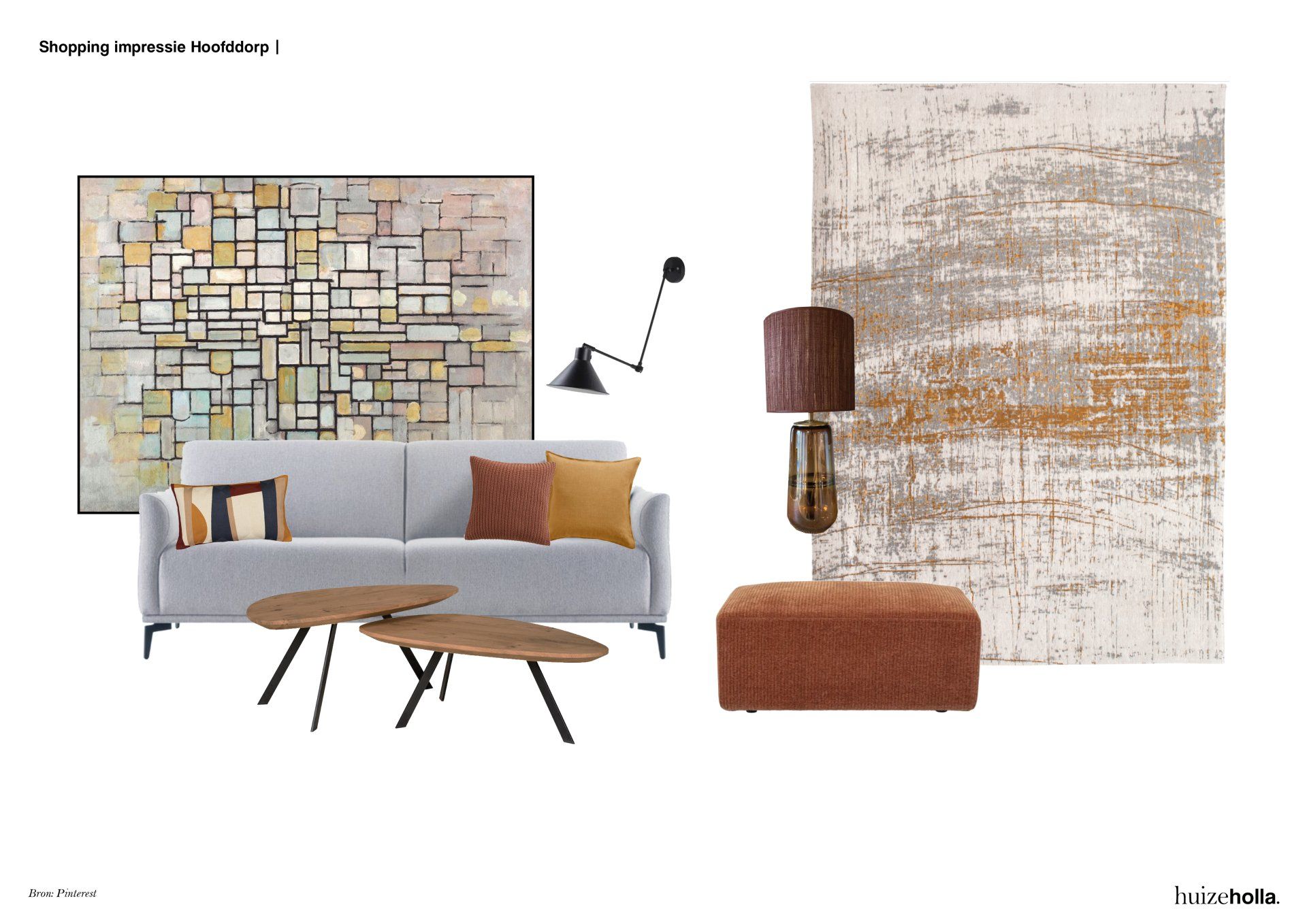 Verder heb ik een kleuradvies mogen uitwerken. Er is gekozen voor een rustige basis waarbij de accessoires en houttint warmte en kleur toevoegen. Door voor enkele grote gebaren te kiezen zoals een grote muurprint en vloerkleed creëerden we verbindingspunten voor bijv. kussens, tafellamp, hocker, bloempotten etc.
