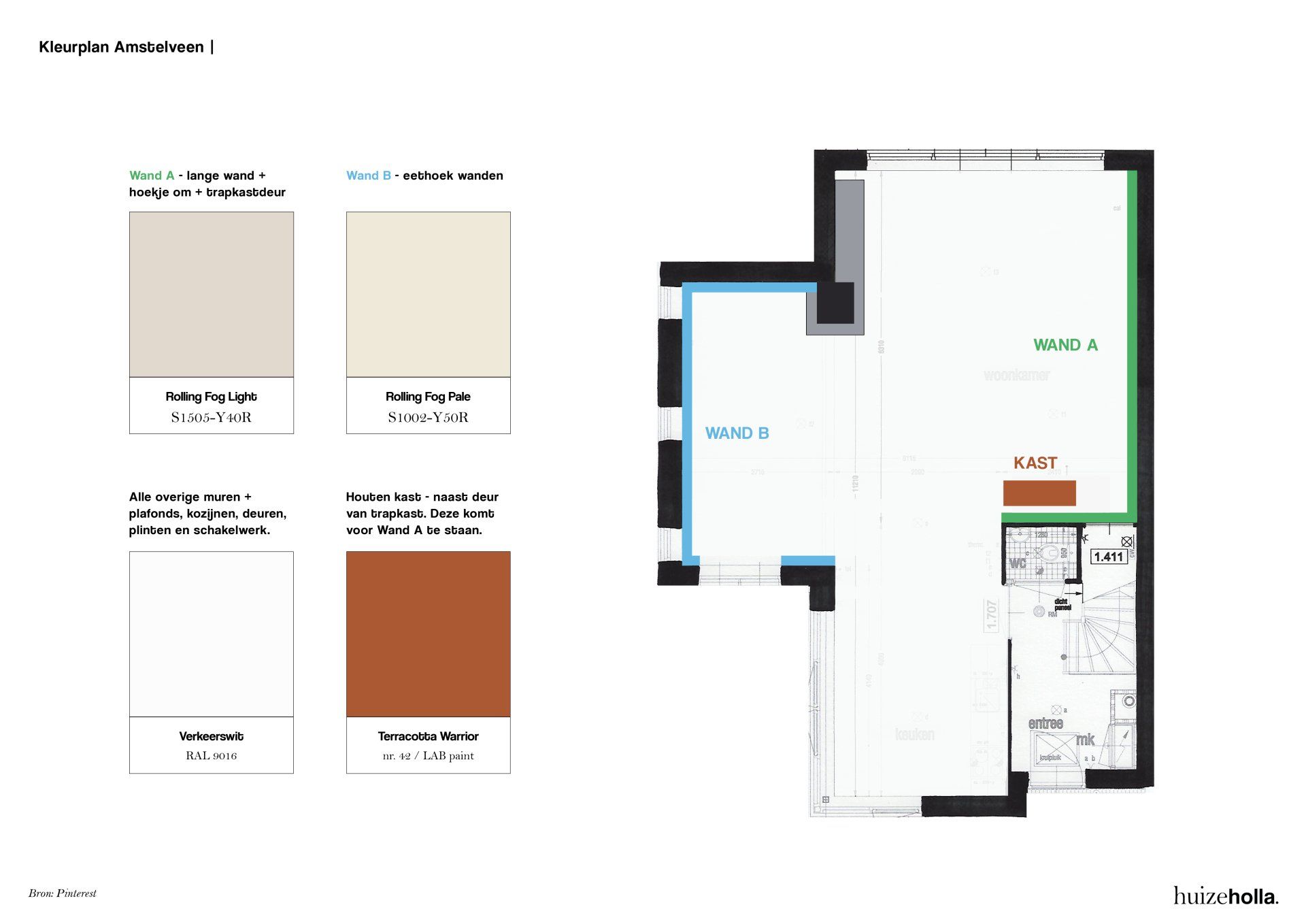 Na een kennismaking bij de bewoners thuis heb ik twee moodboards gemaakt en aan de hand daarvan een kleurplan. Ook is er gekeken naar het verven van een bestaande houten kast en het type raambekleding voor de brede pui aan de achterzijde.