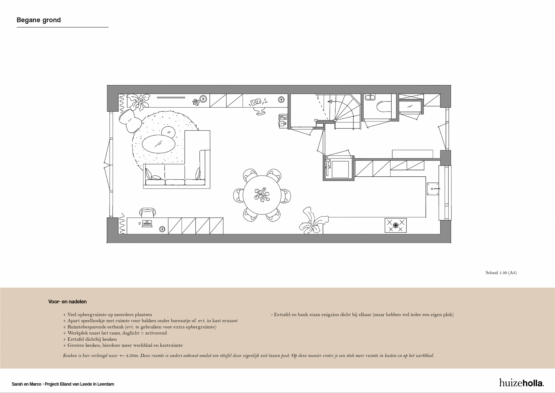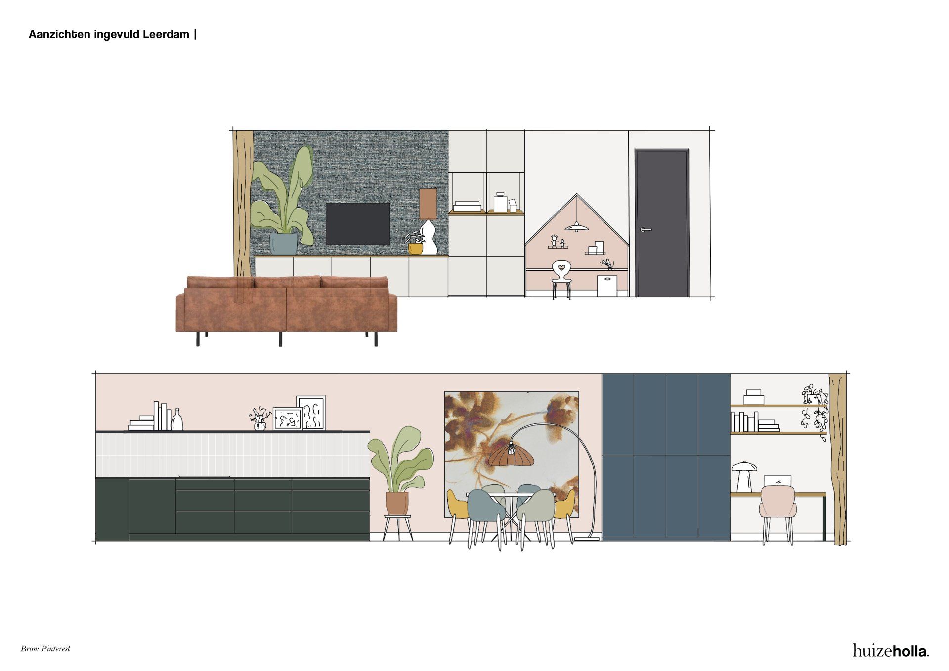 Omdat je als gezin met kinderen al snel veel spullen hebt was het belangrijk voor ze dat er voldoende opbergruimte zou zijn. En ook een gezellig speelhoekje voor de kleintjes was een wens. Daarnaast zou een klein plekje om met de laptop toch in de woonkamer te kunnen werken ook mooi meegenomen zijn. Al deze elementen zijn verwerkt in de verschillende indelingen. Ook is er rekening gehouden met bijv. het meenemen van de huidige bank.