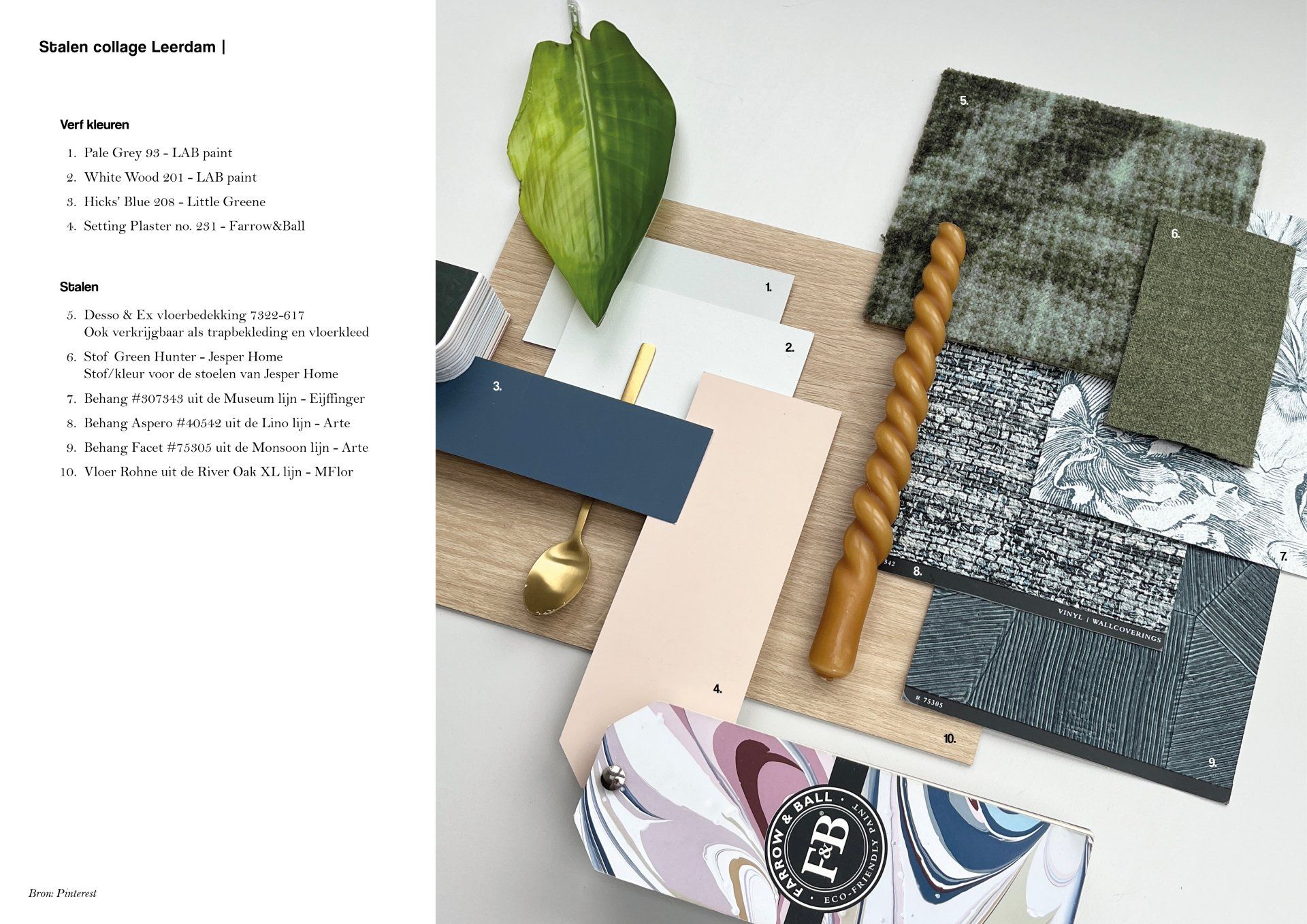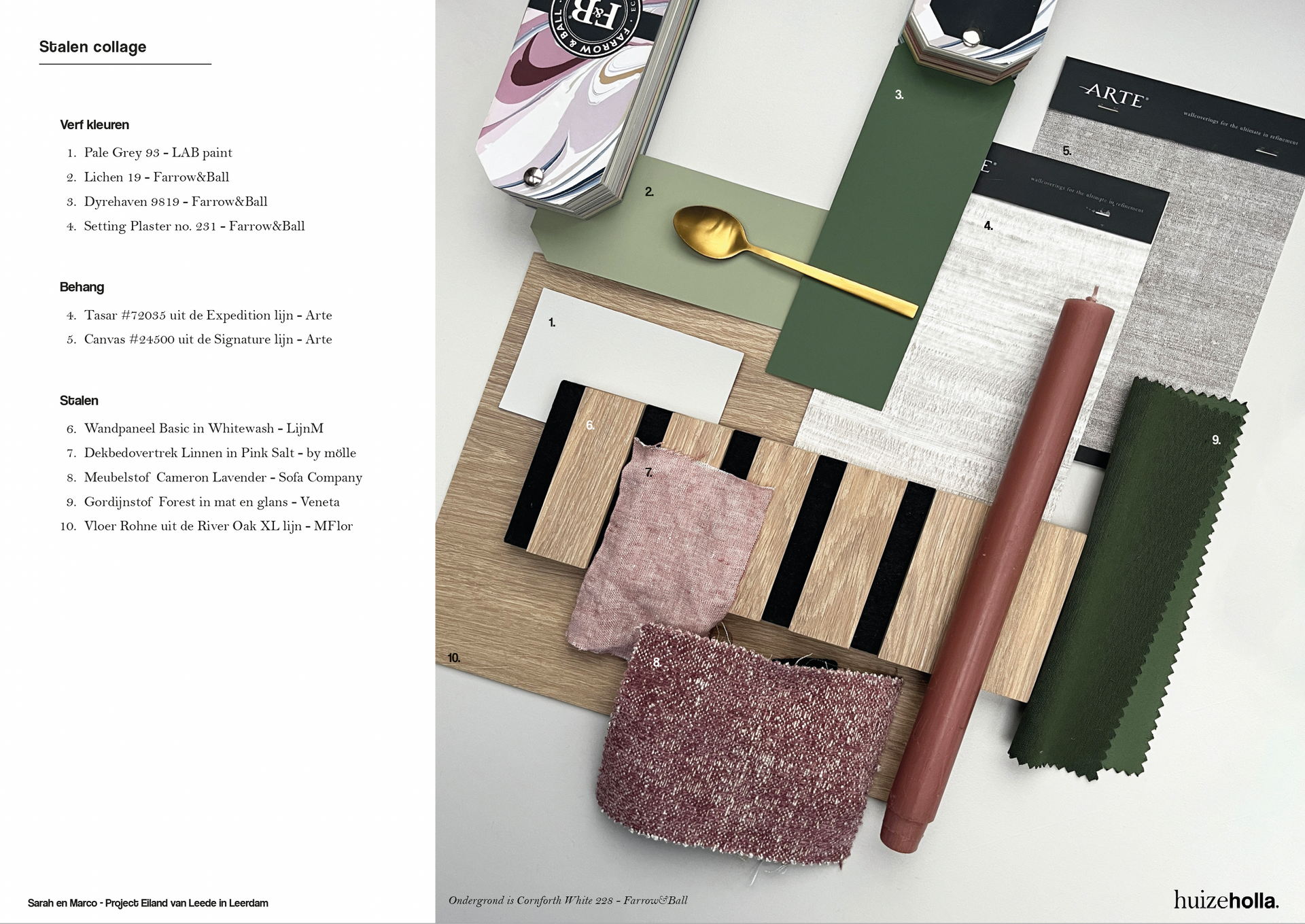 Aangezien er vanuit een nieuwbouwproject deadlines zijn voor de verschillende bouwfases was het belangrijk om als eerst de technische aspecten te bespreken. Zoals licht en elektra, wat ik veelal baseer op de gewenste indeling. Toen indeling en lichtplan afgerond waren zijn we verder gegaan met sfeer en stijl in de vorm van moodboards. Een moodboard werkt als leidraad voor het kleur en behang advies. Deze heb ik uitgewerkt met kleurnummers en behangvoorstellen om daarna bij de bewoners thuis alles te laten zien en ze de opbouw van het kleur en materialen palet uit te leggen.